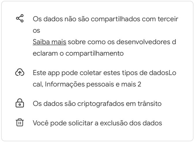 Sua segurança começa com o entendimento de como os desenvolvedores coletam e compartilham seus dados. As práticas de segurança e privacidade de dados podem variar de acordo com o uso, a região e a idade. O desenvolvedor forneceu as informações a seguir, que podem ser atualizadas ao longo do tempo.